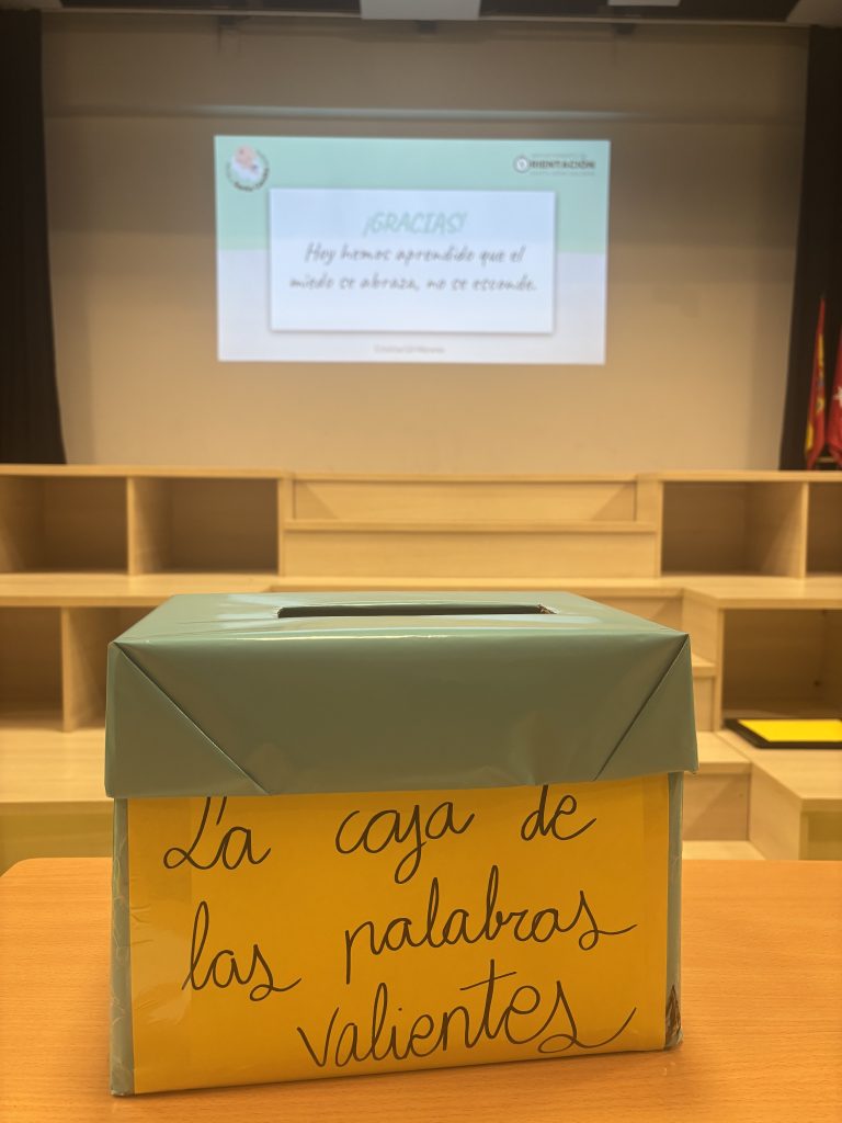 El broche del encuentro fue nuestra dinámica «La Caja de las Palabras Valientes». Fue un ejercicio de profunda honestidad. Padres y madres pudieron expresar por escrito los miedos que les genera la crianza. En el reverso, plasmaron la herramienta de acompañamiento que se llevaban del taller. Este fue un símbolo poderoso: al reconocer nuestros propios temores, nos fortalecemos para guiar a nuestros hijos.
