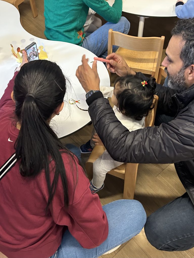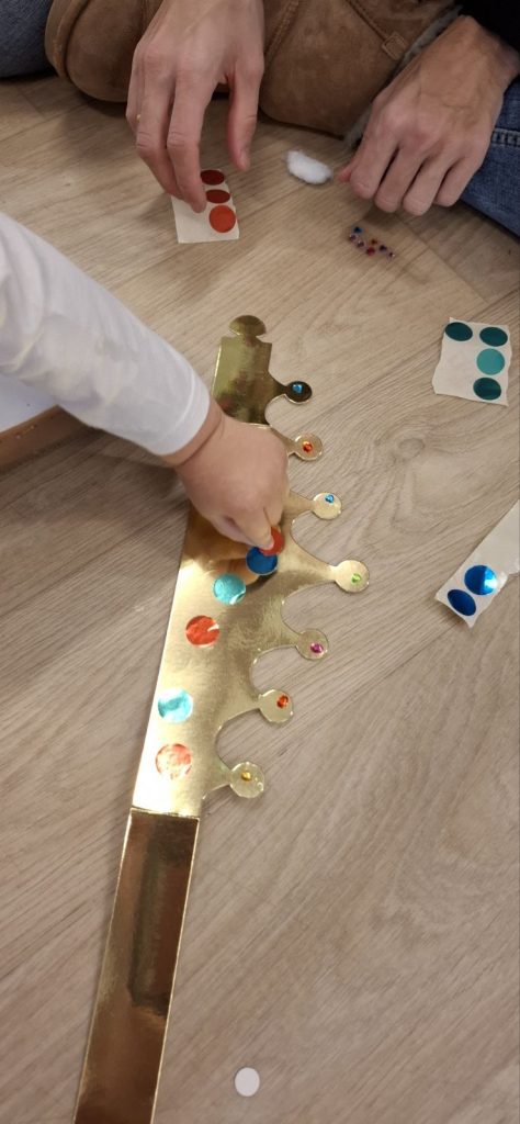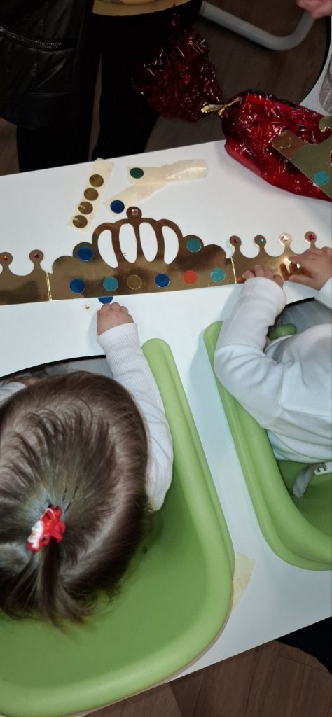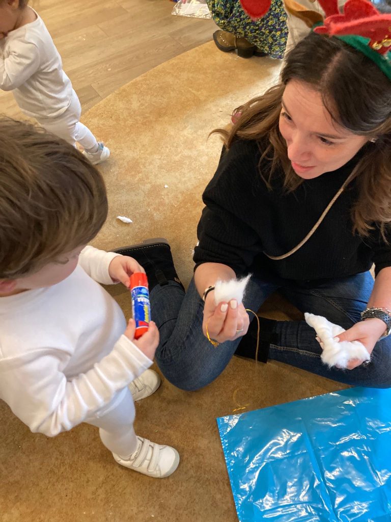 Más tarde, nuestros pequeños se vistieron de blanco o con tonos claros. Así se transformaron en auténticos Reyes Magos y decoraron su propia capa real. Las familias nos acompañaron con alegres atuendos durante estos talleres navideños, creando un ambiente cálido.